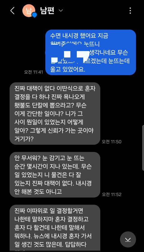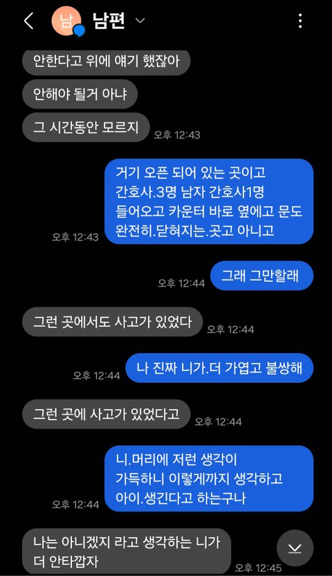 문제는 수면내시경 후 바로 눈뜨고 남편한테 문자보냈어요 눈뜨니 아이들과 당신이 생각났다고 근데 남편이 노발대발 하며 자기한테 말안하고 수면 내시경 했다고 개무시 한다고 하네요.요새 성폭행성추행 사고도 많은데 자기와 함께 시간 맞춰서 가야했었다고.수면내시경 한 곳은 남편이 며칠전 검색해서 찾은 곳 중 괜찮은 곳 말해줘서 남편 본인도 진료 보고 온 곳이고 내시경 침대가 여러개 있어 제가 누워서 기다리는 동안 옆에서 하는 소리 들리는데 간호사 2명 들어가고 의사 한 분 들어와서 진행하네요.커튼으로 되어 있어서 카운터 선생님들도 왔다갔다 하고요.