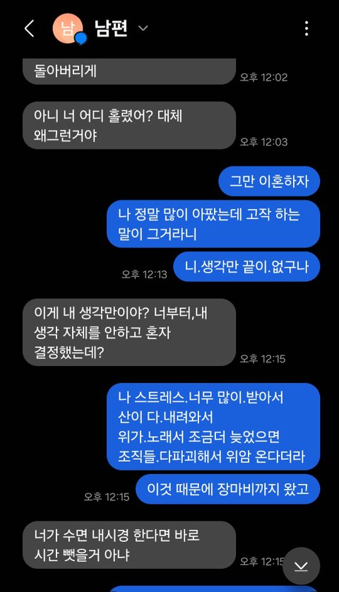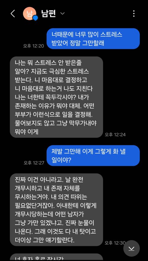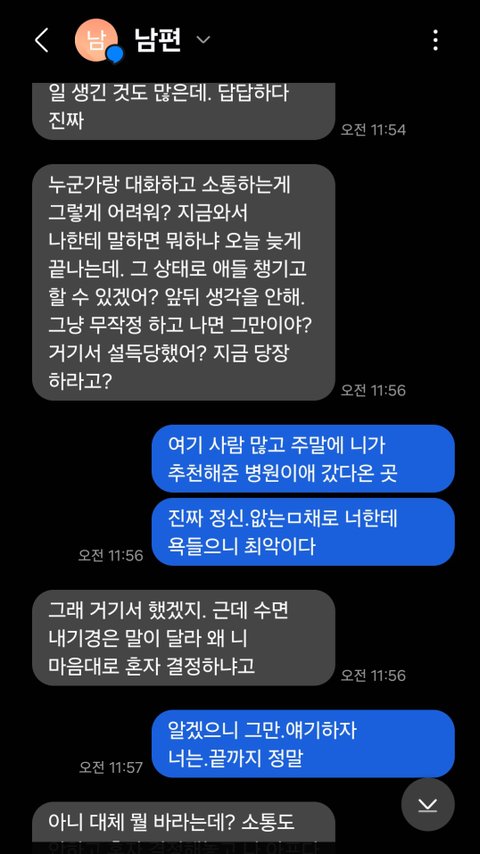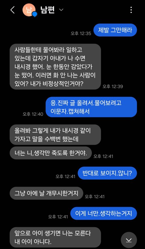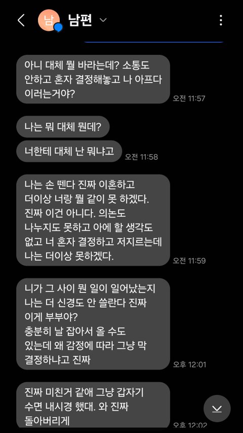 이혼 서류는 낸 상태이고 오늘 일에 대해 너무 속상한 마음에 글 올려요.약국에서도 약 받는데 하염 없이 눈물만 나네요.남편도 글 올려서 물어보라고 저도 궁금한 마음에 글 올려요.두서없이 글이 매끄럽지 못하게 썼어요 긴 글 시간내어 읽어 주셔서 감사합니다.남편과 문자 내용 같이 첨부합니다.