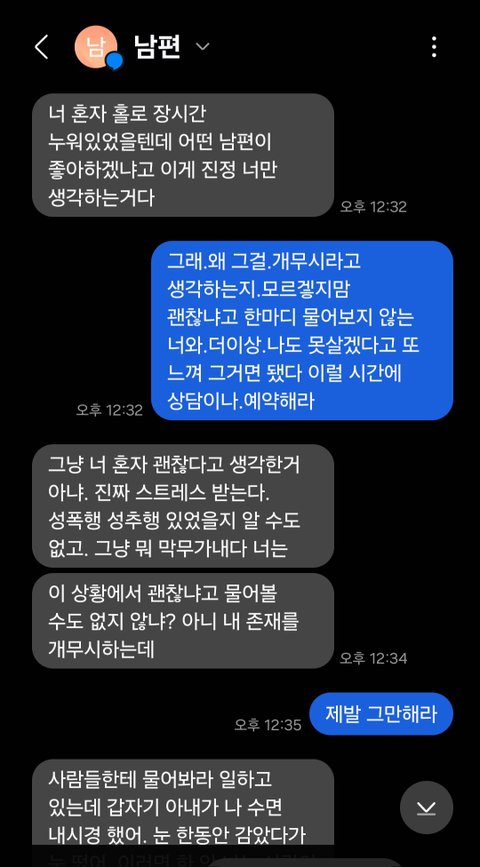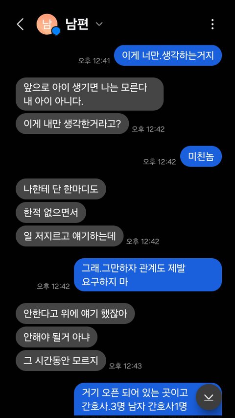 남편한테 괜찮냐고 한마디 듣고 싶었던 거 뿐이었는데 아이 생기면 자기 아이 아니라고 이제 저에게 손을 떼겠다고 하더라고요.저를 완전 성폭행 당했다고 이미 생각해요.저는 이렇게까지 심각하게 생각안하고 제가 아픈것만 빨리 치료 하고 싶어 바로 수면내시경했는데 이렇게까지 잘못한지 몰랐네요.
