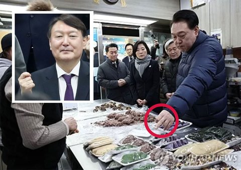 윤석열 대통령이 25일 경기도 의정부시 의정부제일시장을 찾아 떡 가게에서 떡을 고르고 있다