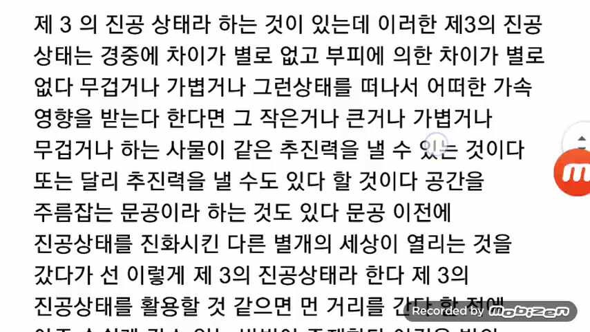 쉽게 말하자면 이런 말씀입니다. 여기까지 이렇게 제3의 진공 상태를 활용하면 어디든지 다 가볼 수 있고 다 올 수 있고 어 모든 부피, 경중 온도 이런 모든 이렇게 차원 말하자면 비례적으로 나눌 수 있는 것을 마음대로 조정하는 단계까지 이르게 된다.