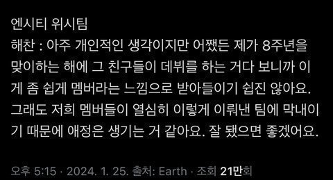 열심히 엔시티 일궈낸 다른 멤버도 아닌 병크멤 해찬이 저런 말을 해서 위시 배척하는 엔시티팬들한테 빌미준다, 우리도 라이즈처럼 엔시티 떼고 데뷔하고 싶었는데 니가 뭔데 못받아들인다고 하냐 등