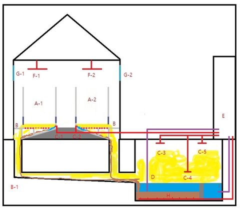 소똥이나 오줌이 밑 틈으로 하강하는 방식이고, C-1과 C-2에는 물을 분사하는데, 기체 농도 센서를 달아서,
