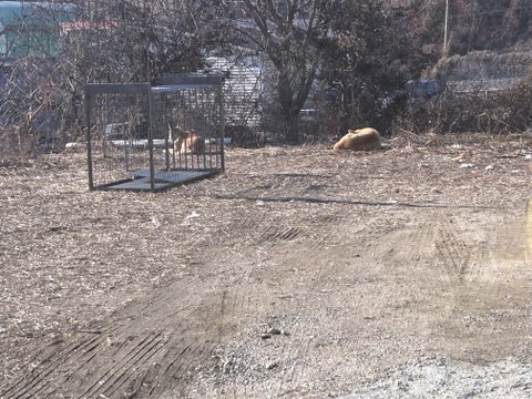 풀려서 돌아다는개 3마리로 얼마전 신고후 오늘 축산과에서 포획들 설치했는데