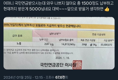 초기에 국민연금 의무 가입시키려고 조건이 엄청 좋았슴. 5년도 안넣고 연금 수령하는 사람들 무지 많아요.