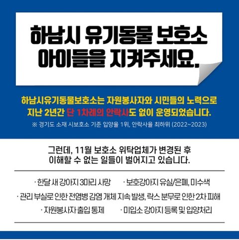 - 하남시 유기동물 보호소에서 11월부로 위탁업체가 변경된 이후로 유기동물들의 안전과 건강에 위협이 가는 이해할 수 없는 일들이 계속 벌어지고 있음.