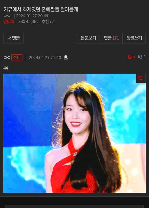 다른 여돌 사진도 반대 많긴 하는데 추천 반대 별 차이 없고 반대가 더 많은 건 아이유 뿐임... 아이유는 유독 까글 추천수도 높고 팬들이 쓴 영업글 주접글은 반대 많더라