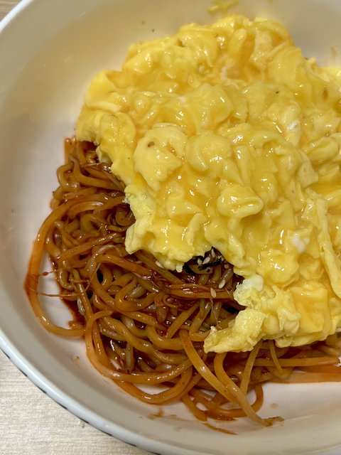 불닭엔 무조건 숙주+참기름 살짝 넣은 스클램블 조합 최고.촉촉 계란에 코팅된 참기름 향과 맵싹한 불닭에 아싹한 숙주 말모