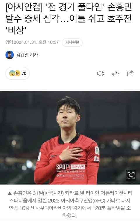 손흥민 탈수 증세 심각하대