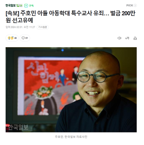 [속보] 주호민 아들 아동학대 특수교사 유죄… 벌금 200만원 선고유예