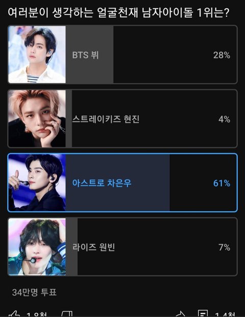 댓글은 뷔랑 현진 원빈이 압도적임 ㅋㅋ 체감상 댓 100개 중 1개만 차은우 이거보고 팬들이 떠들어대도 조용한 머글 못이기는구나 싶음 진짜 냉정하게 평가해줌