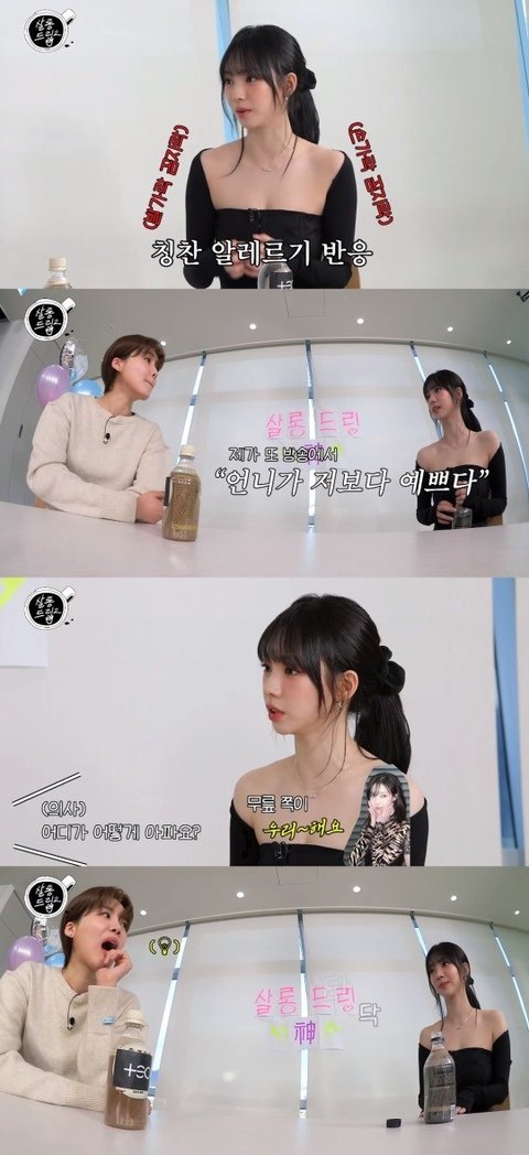 동생들이 편하다며 "집에서 막내라 언니가 확실히 편했는데, 팀의 리더가 되니까 챙겨주는 게 더 편하다. 친언니는 간호사다. 살면서 본 사람 중 제일 착한 사람이다. 연습생 때도 반창고를 챙겨줬다. 멋있다. 어릴 때 언니를 물고 때리고 괴롭혔다. 어릴 때 싸운 거 말고는 없다. 제가 방송에서 '언니가 저보다 예쁘다'고 해서 언니가 엄청 스트레스 받았다. 제가 동생인지 완전 비밀이다"라고 이야기했다.