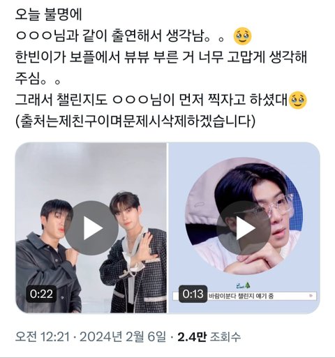 팬 분이 질문해주셔서 대답하신 거지. 그리고 그냥 한빈님이 뷰뷰노래 불러준 거 감사하다고 언급한 건데 글이 의도가 보인다.