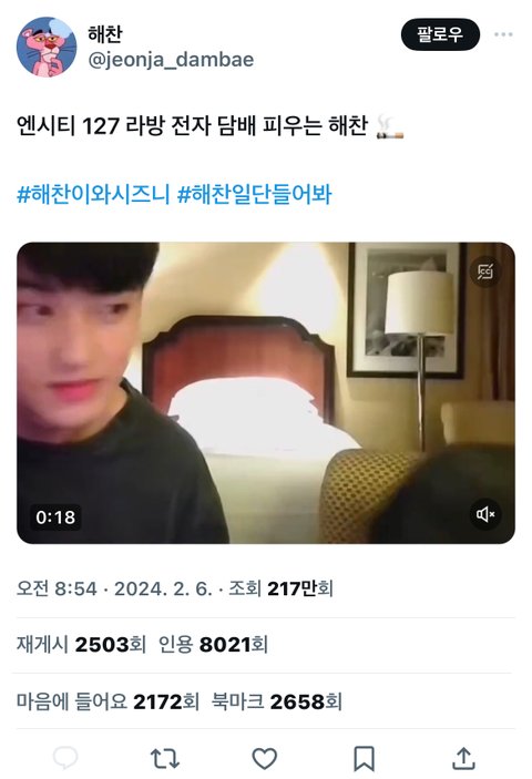 트위터에서 알티 타는 해찬 라방 중 전자담배 영상