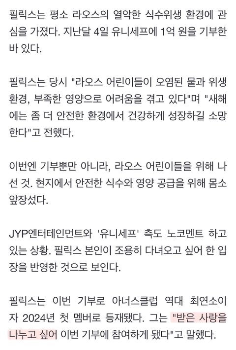 스키즈 자컨 중에서 새해목표 얘기하다가 올해 목표로 봉사가기가 있었는데, 1월 되자마자 1억 기부하고 지금은 연휴 휴가로 라오스로 봉사활동 감ㅜㅜ 너무 힘들 것 같은게, 지금 계속 파리, 일본, 중국, 보그 촬영 등등 쉬지 않고 일정이 쭉 있었음. 그런데도 연휴휴가 안 쓰고 봉사 갔다는 게 진짜 너무 대단하더라. 새해목표가 나왔던 영상이 촬영 자체는 23년도에 했었던 건데, 그걸 1년전부터 미리 다짐하고 실천했다는 게 너무 좋음ㅜ
