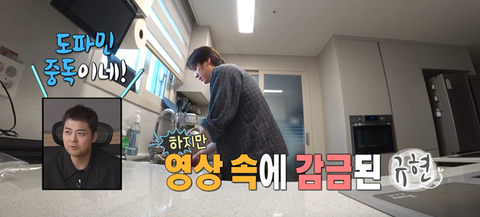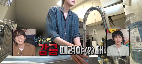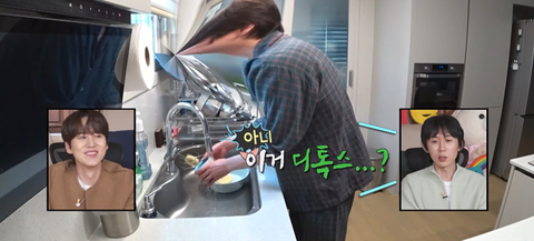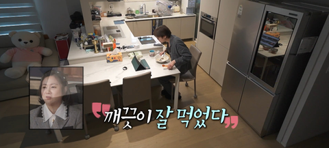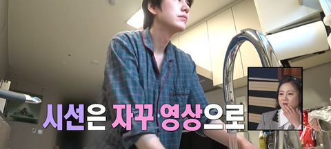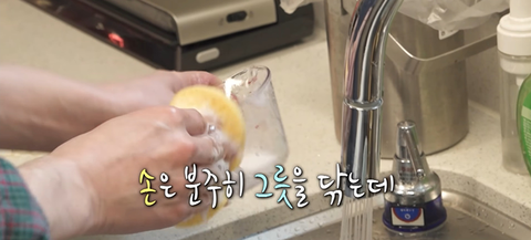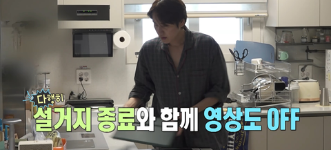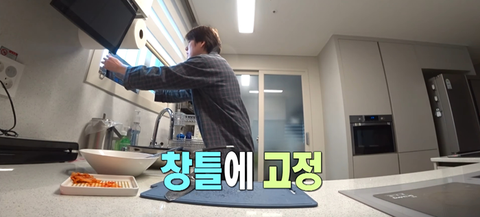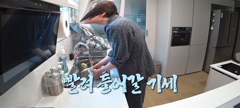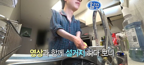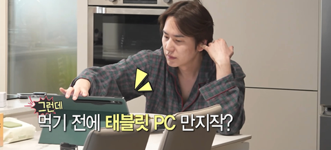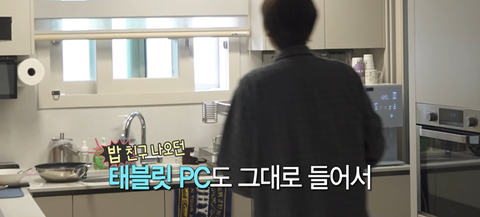보던 태블릿 피씨 그대로 들고 일어나서 싱크대 앞에 둠