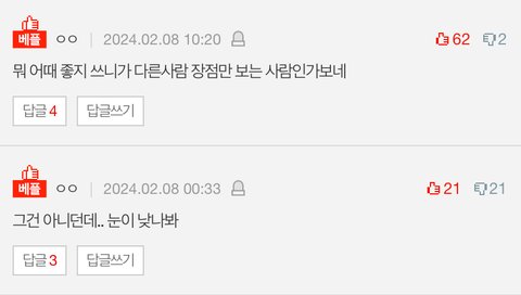 첫번째 댓글없이 두번째댓글만 있었으면 걍 시비 ㅈㄴ거네 ..하고 넘길거같은데 둘이 대비돼서 두번째 댓글쓰니 인생이 ㅈㄴ불쌍해보임