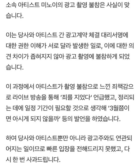 AOMG(미노이 소속사)가 먼저 미노이한테 말 안하고 광고계약 대리서명해버려서 회사랑 미노이 간 의견 차이로 광고주만 새우 등 터져버린거임