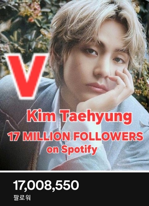 뷔 스포티파이 팔로워 1700만명 돌파 남다른 인기 군백기같은거 못느끼겠다 뷔는 대단해