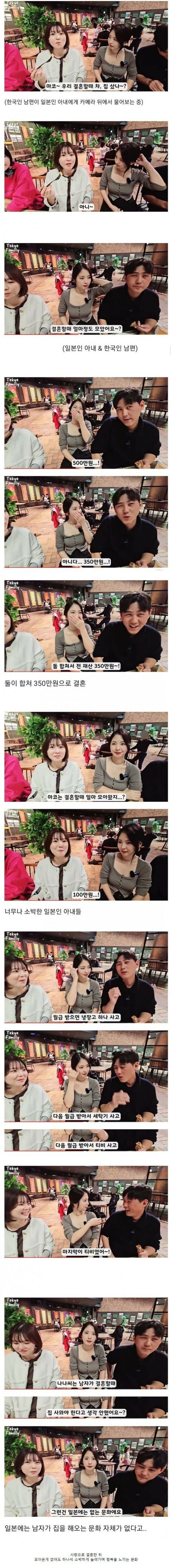 ㅋㅋㅋㅋㅋㅋㅋㅋ 다들 일본 알고 하는 말 맞나? 여자들 대부분이 결혼하면 일 그만두고 전업해야해서 남자 조건 우리나라보다 더 봄 쟤넨 결혼 시 남녀 나이차이가 기본 10살이상이야... 그래서 젊은 남자애들이 결혼 다 포기하고 초식남된거고 자기 또래중에 결혼할 수 있는 애들이 없으니까. 개중에 사랑만 보고 결혼한 1%들의 영상이지 저게 대다수라고 생각하지마...