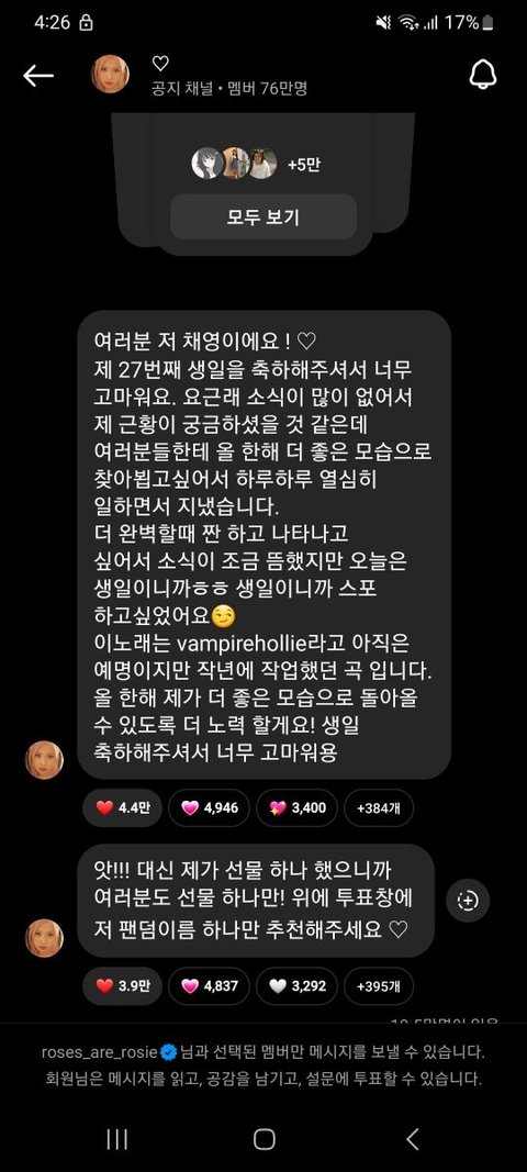 로제 인스타 공지방에 방금 노래 올림