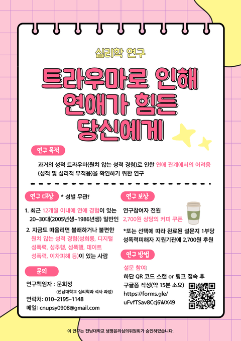 * 자격요건 (성별 무관) 1) 최근 12개월 이내에 연애 경험이 있는 20~30대(2005년생~1986년생) 일반인 2) 지금도 떠올리면 불쾌하거나 불편한 원치 않는 성적 경험(성희롱, 디지털 성폭력, 성추행, 성폭행, 데이트 성폭력, 이차피해 등)이 있는 사람