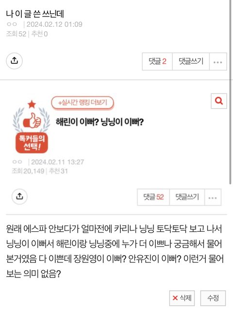 팬들은 첫 주 ar 대놓고 깔린 방송을 라이브라고 주장하더니 진짜 앵콜이 나오니… 화제성이 없으니 망정이지 다른 하이브돌들이 이랬으면 ...