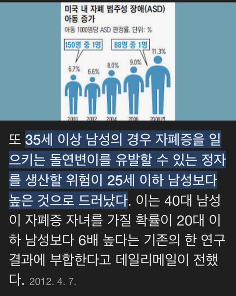 남자가 나이 많아도 자폐아 확률 커요 이상하게도 꼭 자폐아 글 뜨면 여자탓하려고 노산 어쩌구 하는 인간들 많은데 남자도 영향 큽니다 ㅋ