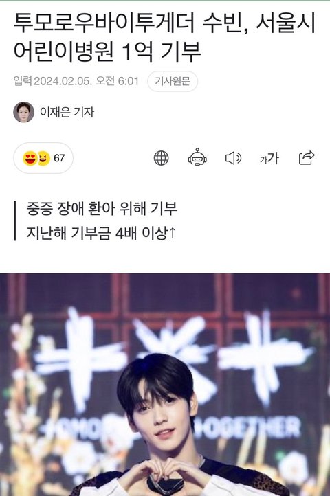 투모로우바이투게더는 최근 수빈이 중증환아를 위해 서울 어린이병원에 1억 원을 기부했다.