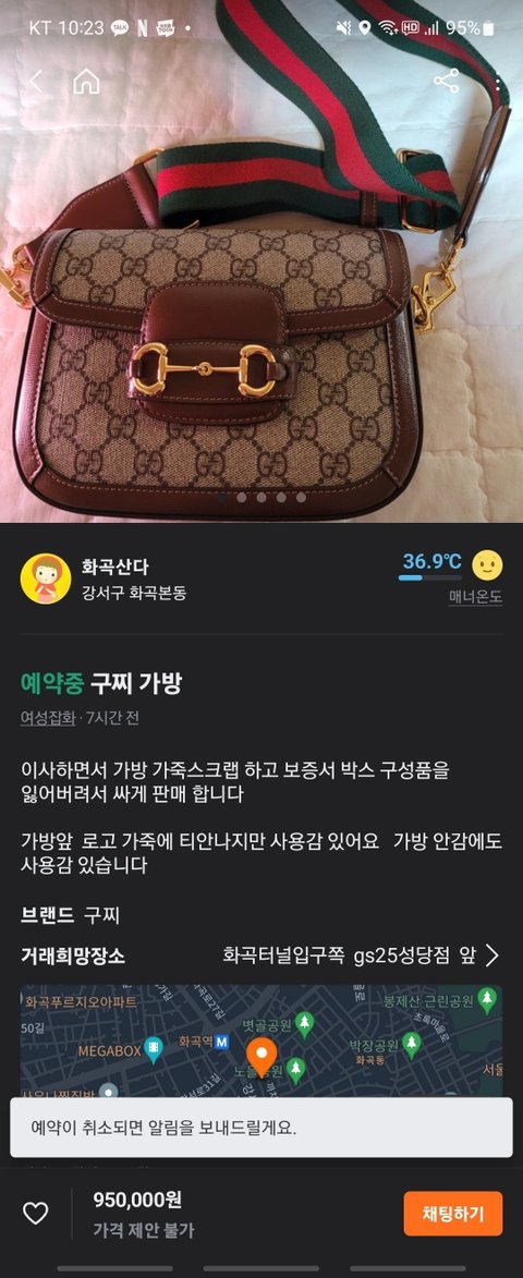 이사하면서 가죽 스트랩이랑 전부 잃어버린 것도 이상하고 보통 당근에 가방 판매하는 사람들은 구찌 홀스빗 미니 처럼 가방 이름을 써놓는데 이사람은 마치 이 가방 이름은 모르고 구찌인것만 아는 듯이 글을 올려 놓은 것임