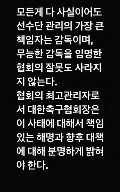 그전에는 뭘 아시아컵 한번으로 협회장을 짜르라고 하나 그랬는데 선수를 보호해야 할 곳에서 오히려 공격을 하라고 기사 빵빵 터뜨리고 공작질하는 거 보고 썩어문드러졌네 싶어서 협회장을 갈아치우는 게 맞다고 생각이 바뀜
