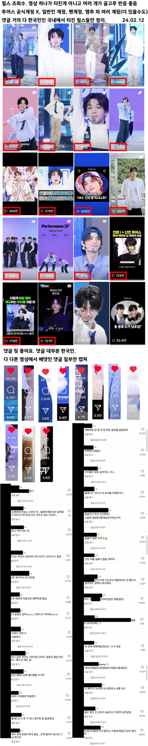 난 더쿠사이트 잘 보는데 거기 핫게시물 조회수나 게시물 올라오는건 그다지 핫하다는 느낌은 안드네 유튜브는 20만대인데 아래댓글 릴스가 저정도인데 구독자수는 아직인가 암튼 이렇게 음원성적이랑 그룹인기가 따로도는 보이그룹은 첨이라 좀 기괴하다란 느낌?