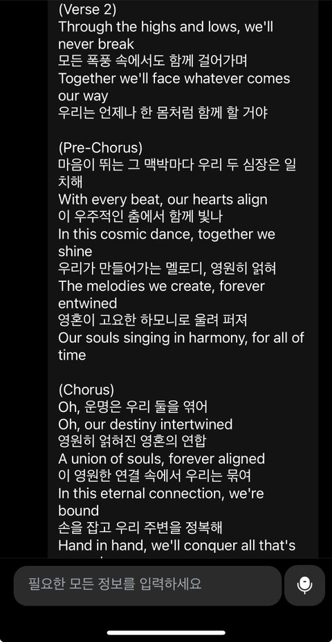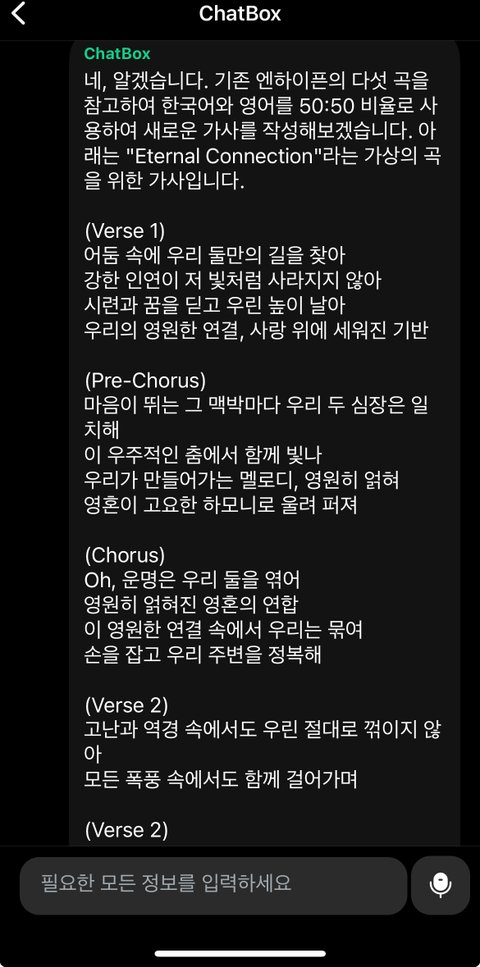 다크문 세계관을 알려주고 기존 노래 다섯 곡을 학습시킨 후 가사써달라 함