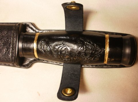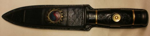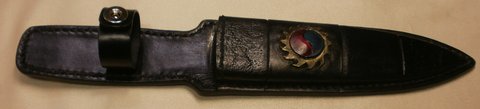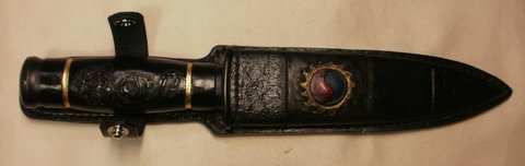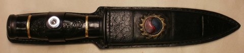 베지터블 가죽에 태극 디자인과 손잡이 부분 용 디자인을 카빙하고 천연 염색하여 제작한 핸드메이드 천연 가죽 정글 나이프 케이스입니다.(마디샤가죽공예