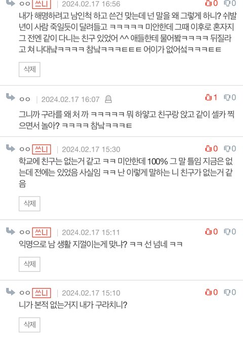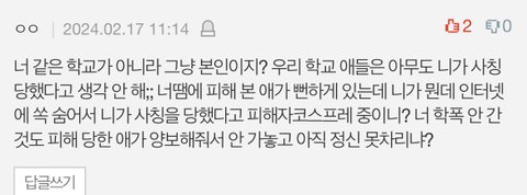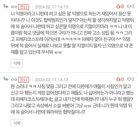 내가 다른 커뮤에서 머리 묶은거 이상하냐고 학교 가디건이랑 뒤에 학교 화장실 살짝 나온 사진 올리고 댓글에 머리 비듬이냐고 하는 사람한테 비듬이 아니고 물칠이라하고 기분 나빠서 댓글에 욕했는데 누가 혹시 ㅇㅇ학교? 이런식으로 학교 적고 나는 싸우자고 인스타랑 톡디 알려줘서 거기 사람들이 내 학교,실명,나이를 알고 있고 그 중 한명이 내 사진,실명,학교,나이로 사칭계정 만들어서 스토리에 내가 썼던 글들 올리고 학교 애들한테 다 팔로우 걸어서 소문났대 그리고 판에서도 모르는 사람들이 자꾸 내 실명 함부로 댓글에 적고 나 안다는 사람들한테 내 얼굴 빻았냐고 하고 나랑 같은 학교라는 애들은 익명뒤에 숨어서 여기서 니 실명 부를까?,같이 앉을 친구도 없어서 무단으로 안 들어오는 주제에 ㅋㅋ,왜 구라를 처까 이렇게 공격적으로 말하면서 사람 협박하고 조롱하고 괴롭혀.. 그거 사이버 폭력 아니야..?