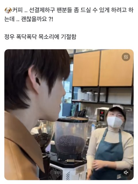 영상 보면 더 착해보임 ㅠ 자기가 음료 사주고 가면서 팬들한테 고맙다는 말만 계속 하고 민망한지 제대로 말도 못함 ㅠㅠ.. 마냥 순둥….몽..하게 사진 몇 장 찍더니 호다닥 나가고..