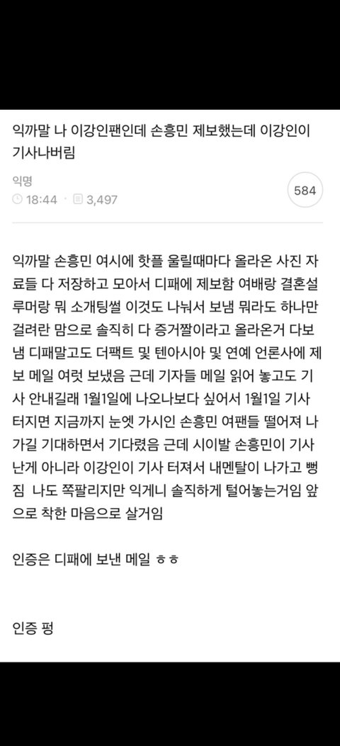 강인맘 중 1인이 손흥민 열애설 찾아내려고 가짜로 언론사 제보 하다가 걸린게 이강인 열애설ㅋㅋㅋ 지들끼리 멘붕오고 난리났음