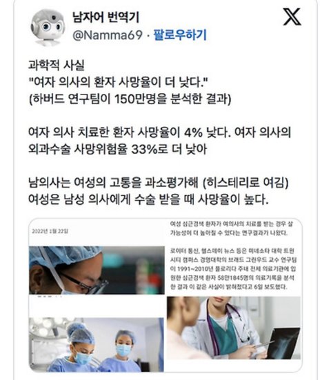 이번에 이화여대 의대 증원하는지 확실히 감시해야 함 이대 의대 증원하면 총선에서 국힘 보이콧 해야 함 여성쿼터제 증가 절대로 방관해서는 안 됨 참고로 여의사 줄이는 방법은 단순함 (1) 입시제도 변경 - 수시 폐지, 수능 100% (2) 수능 수학, 과학 강화 - 범위 증가, 난이도 상향 (3) 의사 면허 취득시 병역 의무 부과 (군필자 제외) 여자들 지능 낮아서 수능에서 남자들한테 개쳐발리잖아 그래서 수시 늘리는거임. 수시는 사실상 여성쿼터제라 봐도 무방함 어떤 집단의 여성비율과 비효율성은 비례함 여자 많으면 돈만 나가도 피곤함 괜히 기업에서 여성 기피하는게 아님 공직만 보더라도 여자 공무원 많아지니까 야간 당직 공무원 추가로 뽑잖아 얼마나 비효율적이냐