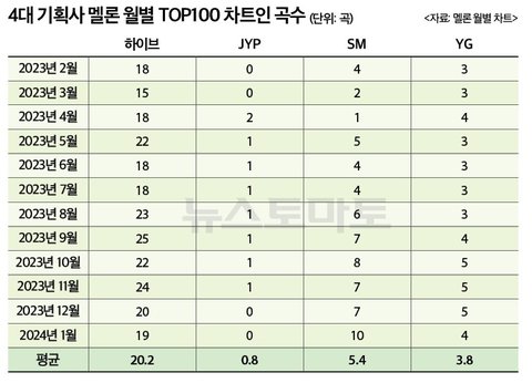 20일 (뉴스토마토) 자체 조사에 따르면 2023년 2월부터 2024년 1월까지 JYP엔터는 멜론 차트 기준 월별 TOP100에서 평균 0.8곡을 기록해 4대 기획사 가운데 최하위를 기록했습니다. 같은 기간 하이브가 20.2곡, 에스엠(041510)이 5.4곡, 와이지엔터테인먼트(122870)가 3.8곡을 차트에 진입시킨 것과 큰 차이가 납니다.