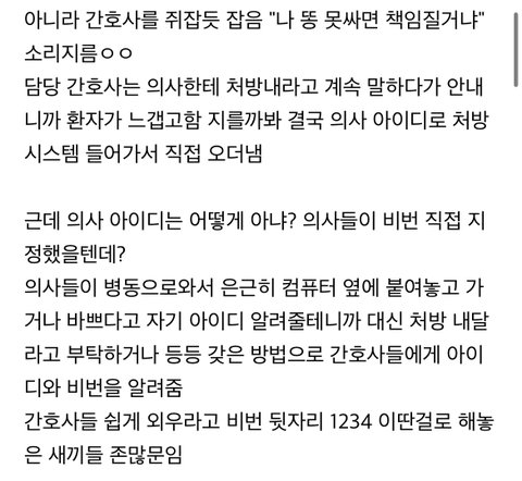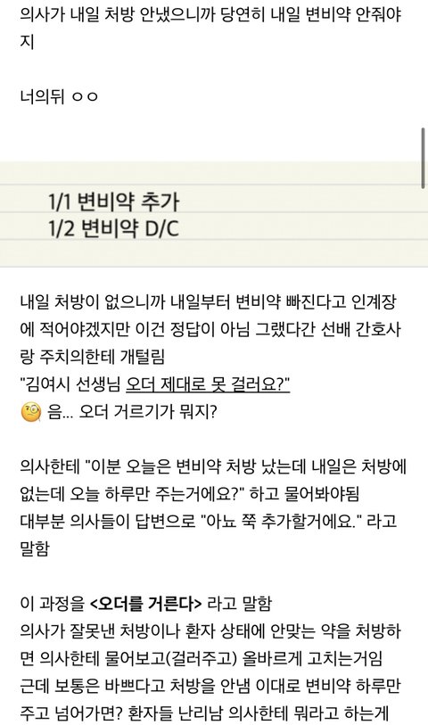 의사가 오더 엉터리로 내는 경우 많아서 간호사가 걸러야 한다고 함