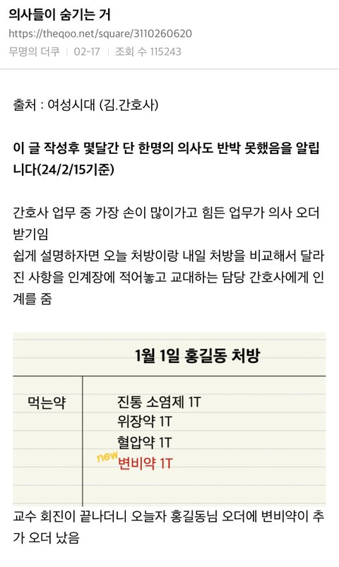 우리아빠 탑5병원입원환자임 저 말 백퍼 사실이닷. 저걸 오더거르기라고 하는구나. 오더거르기? ㅎㅎ 보호자인 우리엄마가 한다. 퇴원해야하는데 약 처방이 잘못나와서 의사올때까지 동동거리며 기다리는 게 3번 중에 2번은 된다. 약처방이 지난번이랑 다르니 간호사 쌤들에게 전달, 어머니 확인해볼게요, 두시간 세시간 의사선상님들 점심시간걸리면 더 기다림. 늦게서야 죄송하단 말 한마디 없이 다시 오더내려옴 ㅋ 간호사쌤들이 미안하다고 전달함 ㅡㅡ 오더 거지같이 내려놓은게 요즘 파업하고 있는 전공의들 같은데.. 심지어 우리엄마가 오더가 이상해서 교수님회진할 때 여쭤보면 그 전공의 주치의들이 우리엄만테 눈을 찡긋찡긋함. 지가 갈굼당할 거 같으니 보호자인 우리엄만테 담당교수님한테 말하지 말라는 거겠지.. 근데 그 젊디 젊은 자식보다도 더 어린 의사선상님들에게 컴플레인도 안함. 왜냐고? 또 우리아빠는 입원하러와야하거든. 환자들이 밀렸는데 혹시나 우리아빠 입원오더 안내려줄까봐 그냥 넘기고 넘김. 우리아빠가 하루 먹는 약이 다 합쳐서 스무알은 넘지 싶은데 우리엄마가 이거 내가 더 할머니 되어서 병수발 시작했으면 챙기지도 못해서(오더거르기) 니 아빠 잡았겠다 하더라. 사명감? 개나줘라. 그리고 저기서 저러고 있을 시간에 환자 오더나 제대로 파악하든지 지 일도 못하는 주제들이 저기서 왜 저럼? 우리아빠가 5년넘게 투병중인데 TV에 나오는 의학드라마들이 가장 판타지임. 타임슬립 드라마보다 더 판타지라니깐? ㅋㅋㅋ 인터넷에 돌아다니는 전공의입니다 이러면서 감정에 호소하며 쓴 글들이 웃기지도 않음. 누구도 시키지 않았는데 사명감 하나로 이 길을 묵묵히 걸었습니다 라고 블라블라. ㅋㅋㅋㅋㅋㅋㅋㅋㅋㅋㅋㅋㅋㅋㅋㅋㅋㅋㅋ 미친 지나가던 똥개가 웃겠다.