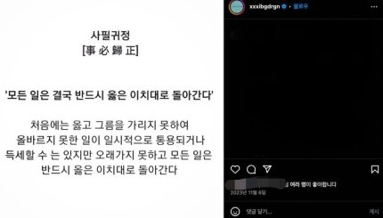 '사필귀정'은 모든 일은 반드시 바른길로 돌아감을 뜻하는 고사성어로, 최근 가요계 선배인 지드래곤이 자신의 마약 투약 의혹을 부인할 때 게재한 멘트로 이미 한차례 화제를 모은 바 있다. 지난해 말, 마약 의혹을 받은 지드래곤은 직접 경찰조사에 출석하는 등 결백을 주장했지만, 당시 일부 누리꾼들의 의혹을 말끔히 잠재우지 못했다. 그러자 지드래곤은 '사필귀정'이라는 멘트를 SNS에 게재했고, 실제로 얼마 지나지 않아 수사가 무혐의로 종결되며 마약 의혹을 말끔히 지워낼 수 있었다.