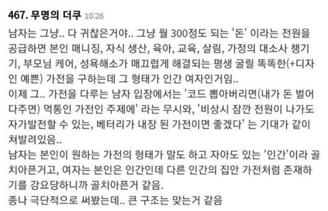 나도 밑댓처럼 걍 달에 입주도우미보다도 싼 금액 주고 청소하고 빨래하고 밥하고 내뒷바라지하고 우리부모님케어하고 명절에 우리집에서 시중들어주고 우리집 제사지내주고 육아하고 애까지 대신낳아주고 일끝나고 집에가면 반겨주고 하소연들어주고 쉑스도 해주는 남편 가지고싶다… 진짜 가성비 개미쳤는데?