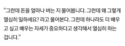 "그런데 돈을 얼마나 버는 지 물어봅니다. 그런데 왜 그렇게 열심히 일하세요? 라고 물어본다. 그런데 하나라도 더 배우고 싶고 배우는 자세가 중요하다고 생각해서 열심히 하는 겁니다."