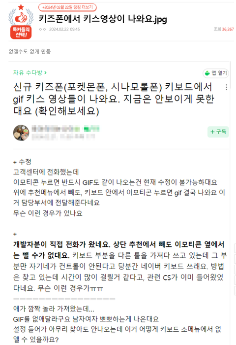 시나모롤 키즈폰 샀을 때.. AS센터 얼마 없어서 불편하고 중소기업 기술력에 잔고장 많다는 거 어차피 1년 쓰고 바꿔준다 생각하고 샀어요. 아이는 시나모롤 좋다고 하니까..근데 이건 좀 심각하다고 생각해요. 자기들이 고칠 수 없으니 다른 키보드를 깔아서 써라? 다른 깔아서 쓰는 키보드는 광고 뜨고 네이버 이동 버튼 있고, 그게 아니면 돈 주고 사서 깔아야 하는데 무책임하게 방법이 없다고 태평하게 얘기하는 게 아주 화가나요 이런 걸 키즈폰이라고 만든 ALT나 그걸 사서 애들한테 파는 SKT나 KT나 다 끼리끼리같고 이렇게 '키즈' 단어로 돈장사 하는 거 보니 환멸이나서 글 올려요ㅜㅜ