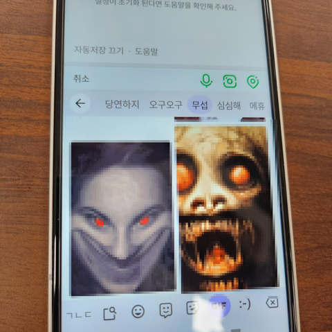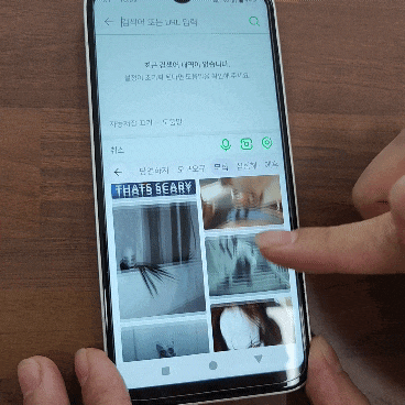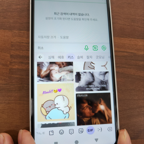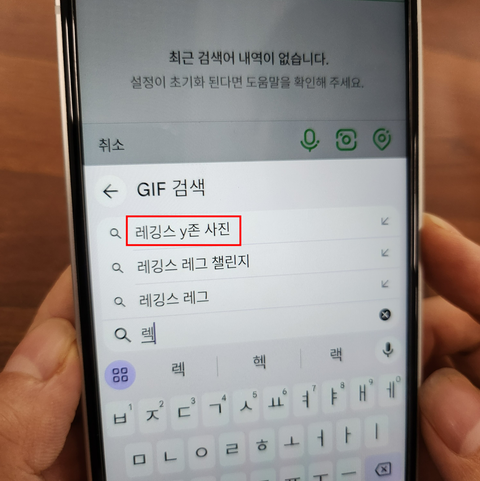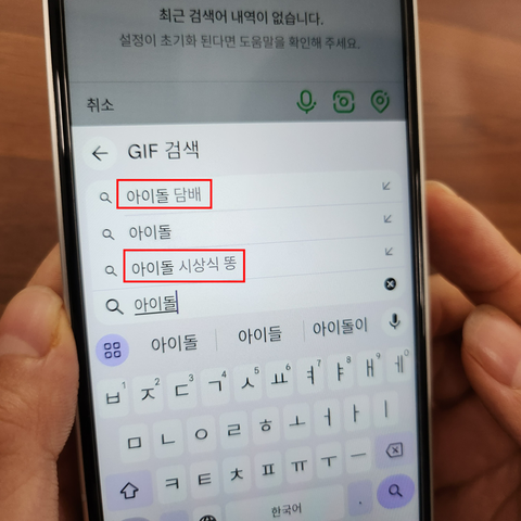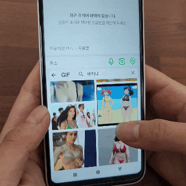 이전에 우리 아이가 쓰는 GIF는 산리오 캐릭터나 귀여운 강아지 고양이 영상이였어요. 그래서 GIF 검색 기능도 많이 쓰는 걸 알았구요. 제가 몇가지 단어를 검색해보는 과정에서 GIF 검색어에 자동완성 기능이 위에 자동으로 뜨는 것을 확인했어요. 예를 들어 “렉”라고 치면 '레깅스 Y존 사진'이 자동 완성으로 나오고, '아이돌'이라고 치면 '아이돌 담배', '아이돌 시상식 똥'이 자동 완성으로 위에 뜨고 있어요. 아이가 일부러 검색하지 않더라도 아이의 호기심을 자극할만한 단어들이 자동으로 노출되니 아주 가관이에요.