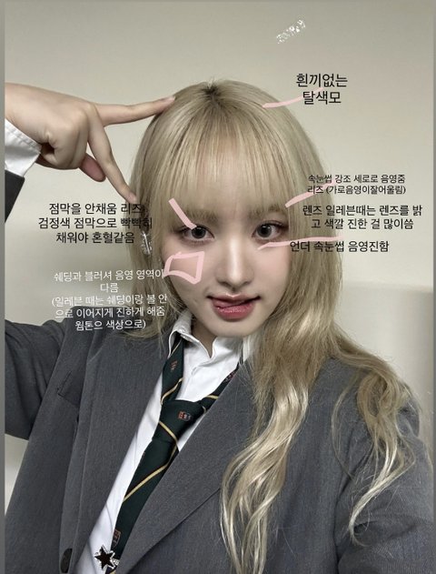 눈 음영 세로로 줌 점막보다 속눈썹을 위에 언더 진하게 다 붙임 애굣살 밝히는게 아니고 어둡게 자꾸 음영 넣음 렌즈 어두운 렌즈 많이낌 뒷트임 너무 심하게 줌
