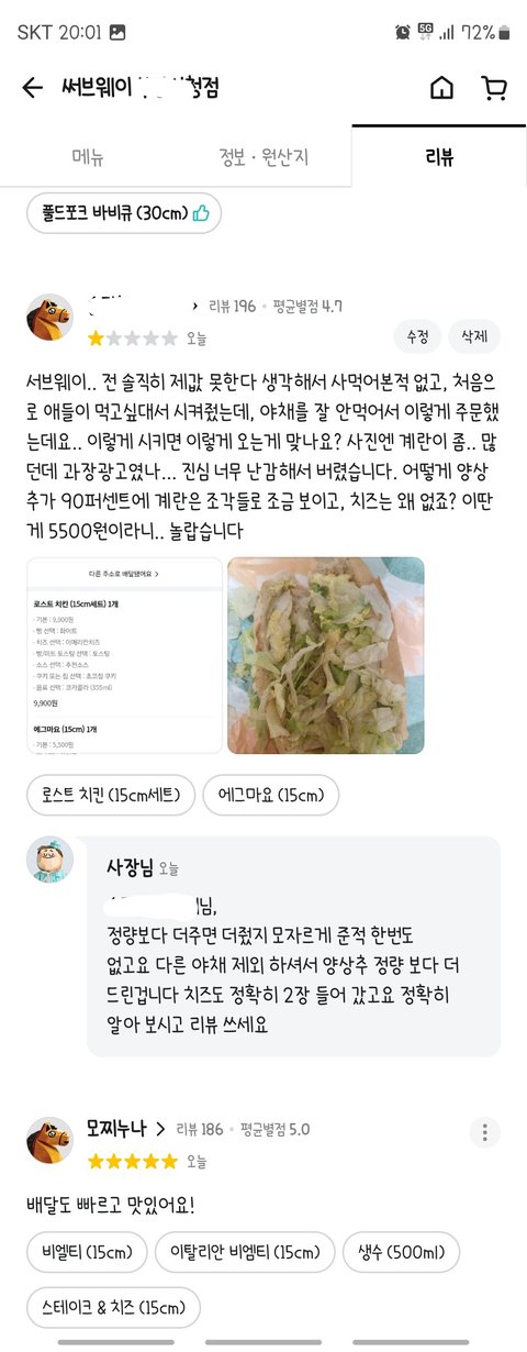 이어 사장님이 댓글을 남겨주셨는데 야채가 양상추만 있어서 정량보다 더 줬다, 치즈는 두장 들어갔다며 알아보고 댓글쓰라 하시던데