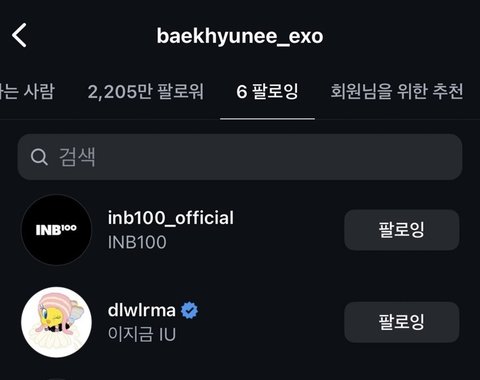뭐지? 백현 원래 팔로우 0이었다가 그 롤 이즈리얼 하면서 해외멤들 얼떨결에 팔로우하고 아이앤비 팔로우했는데 뜬금 아이유 뭐지.. 팔레트 나간다고 해서 팔로우까지 하진 않을 것 같은데