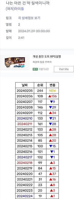 멜론에서는 첫 진입 순위가 87위로 시작 했는데 1주일만에 20위권 진입